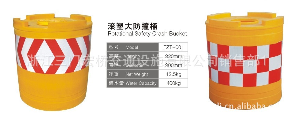 1、防撞桶为一次性成型,耐热、耐寒、耐冲击,不易老化。 注满水后更具缓冲弹性,放空水后可灵活移动。