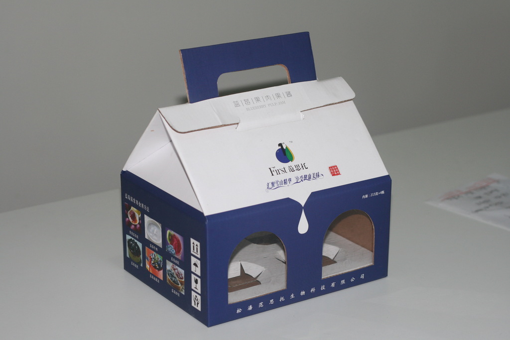 此盒为瓦楞纸产品包装盒,可作礼品盒使用,配有塑料提手,采用白板纸裱E型瓦楞,表面彩色或单色印刷,折叠成型,适合各类行业或产品的礼品盒彩箱。1000个起订,定单式生产,生产周期为5-7天,量大更优惠,请联系客服。规格画面均为定制,可按您的要求来设计生产,设计免费。