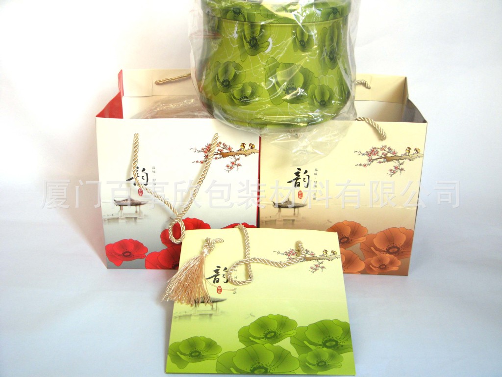 铁盒是通用的,什么产品都可以装,不仅仅用于茶叶,还可以装其他诸如金线莲,中药材,葛根粉等等。盒子和提袋是配套的,彩印的文字内容是:“韵”印象