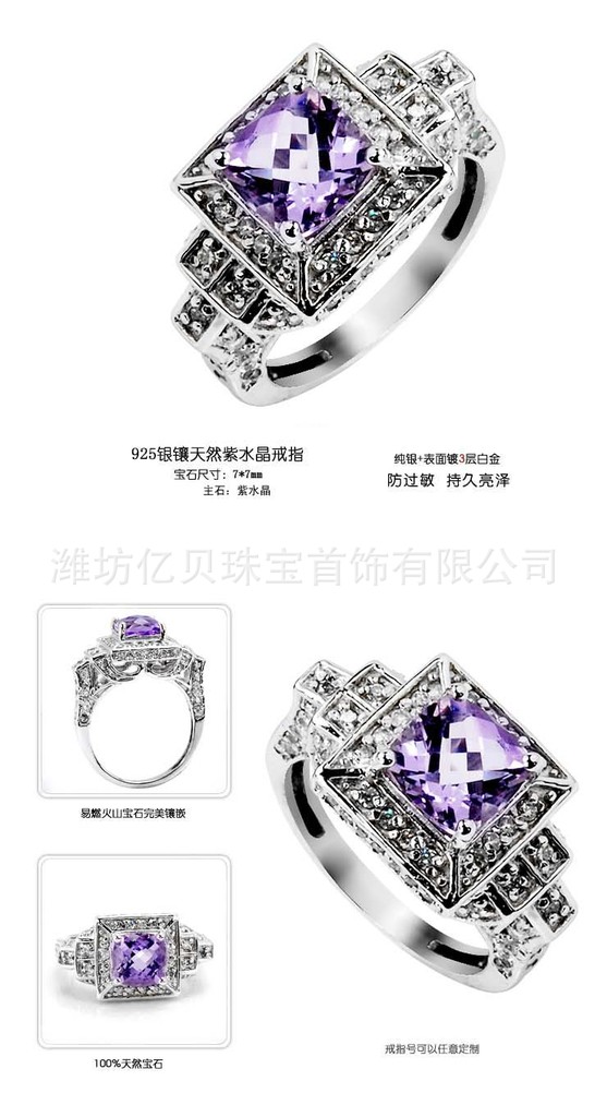 名称:易燃火山925银镀白金天然紫晶戒指SR0093A