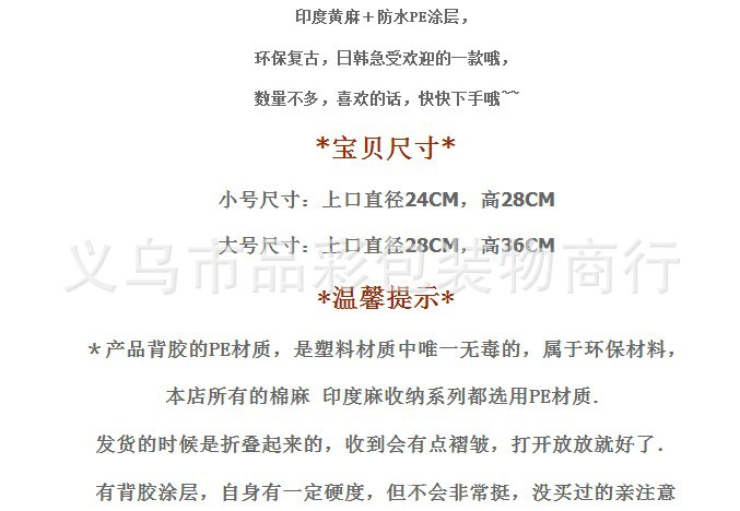 小号尺寸:上口直径24cm,高28cm 大号尺寸:上口直径28cm*高36cm(mm*mm)