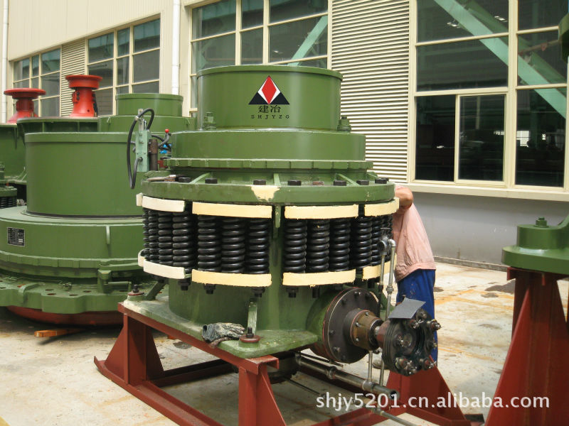- 本机具有结构可靠、生产效率高、调整方便、产品粒形佳、粒度分布均匀、使用经济等特点,目前国内外广为使用。弹簧保险系统是过载保护装置,可使异物铁块通过破碎腔不危害破碎机。