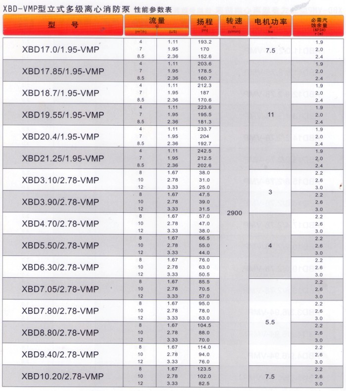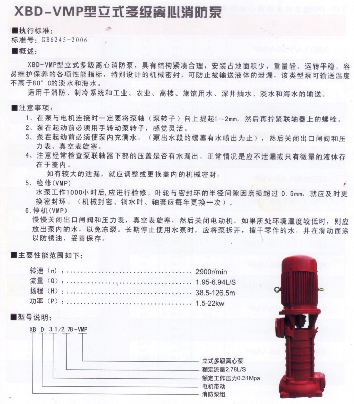 XBD-VMP型立式多级离心消防泵,具有结构紧凑合理,安装占地面积少,重量轻,运转平稳,容易维护保养的各项性能指标,特别设计的机械密封,可防止被输送液体的泄漏,该类型泵可输送温度不高于80度的淡水和海水。