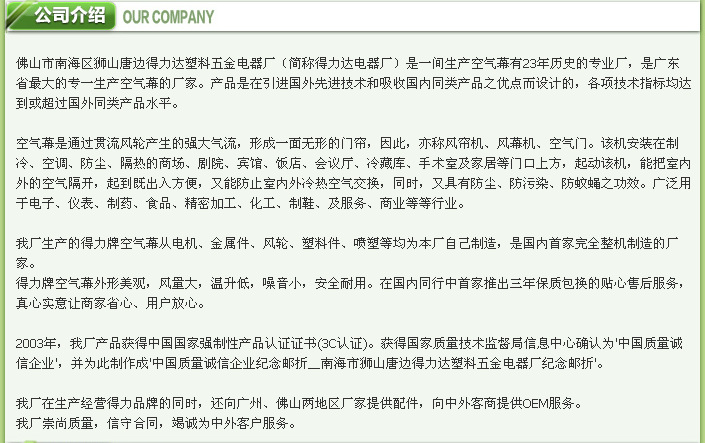 得力牌风幕机经历了二十四个春秋的市场检验,它以风量大、温升低、噪音小、安全耐用而扬名中外。“三年内如有质量问题可免费更换(国内用户)”的保质售后服务措施深受广大用户欢迎。力求做到“让商家省心,用户放心”。营销合作,OEM合作均可,欢迎垂询。