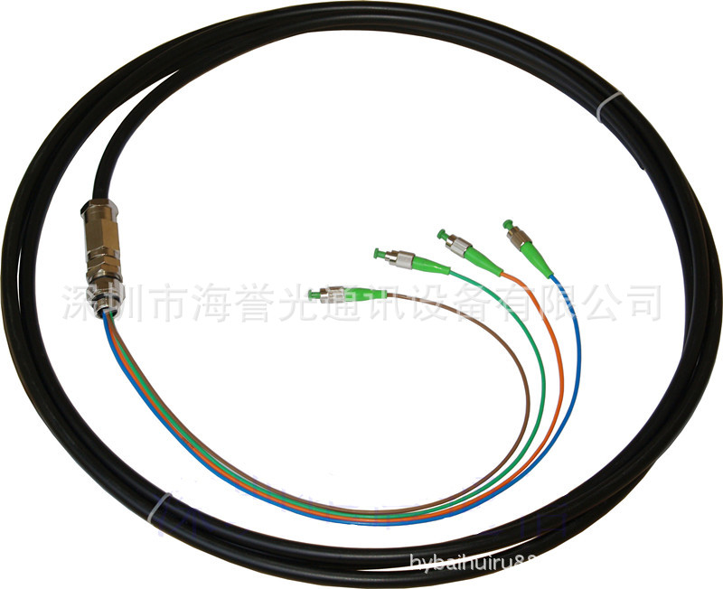 防水尾缆采用一根或多根单芯光缆绕一中心加强件绞合,纵包铝塑复合带,外挤护套而成。阻水带绕包,阻水效果好,适用于野外恶劣环境,采用高强度钢丝加强,抗拉、接地性能良好安装方便、简单可靠,可连接各种型号的连接器,将光缆与光接收机连接。