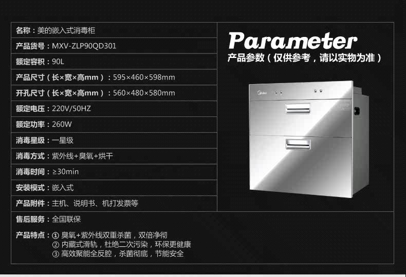 产品名称:Midea/美的 MXV-ZLP90QD...净重: 23Kg包装尺寸: 700×570×695mm品牌: Midea/美的型号: MXV-ZLP90QD301安装方式: 镶嵌式尺寸: 595×460×598mm是否有童锁: 否毛重: 26Kg消毒星级: 一星级面板材质: 钢化玻璃颜色分类: 镀膜玻璃外观: 双门消毒柜容量: 81L(含)-100L(含)消毒温度: 低温消毒(小于60摄氏度)消毒方式: 臭氧 紫外线消毒时间: 30分钟及以上