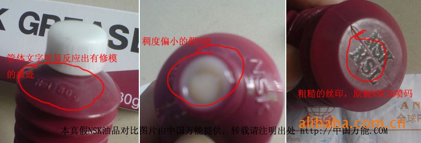 假油脂的利润高,好挣钱,制假/售假者疯狂散播假NSK/THK油脂,多数用户不懂识别,希望购买者多加对比实物,认真学习,提高自己的识别能力. 其实制假都是一些损人利已的小商人,做出来的东西也真的很粗糙,只要认真对比实物,不难辨别的.
