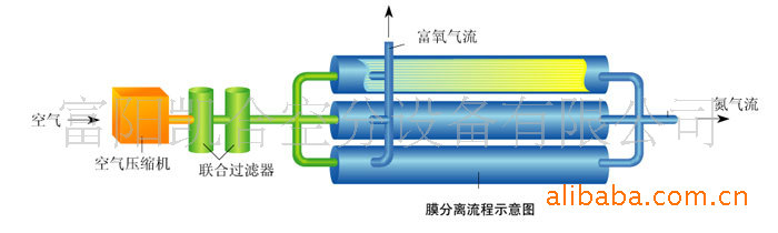膜制氮设备,膜分离制氮设备,空分设备,深冷空分设备,高纯氮设备,液氧设备,液氮设备,PSA制氮机,PSA制氧机,变压吸附制氮机,变压吸附制氧机,分子筛制氧机,工业制氧机,膜制氮设备,高原制氧机,富氧燃烧制氧机,冷干机,吸干机膜分离制氮设备是利用一种高分子聚合纤维材料作为分离元件,当带压空气通过膜纤维毛细管时,空气中水蒸汽、二氧化碳、氦气、氧气等快速易渗透气体组分扩散到膜纤维毛细管外,不能透过的氮气则作为氮气产品输出。