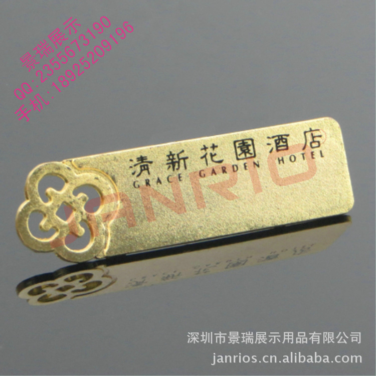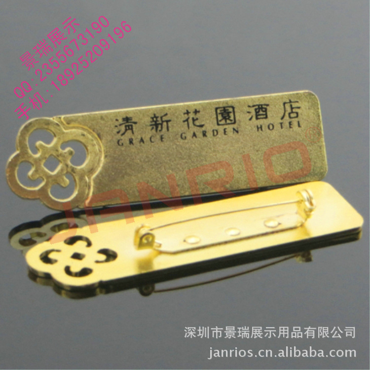 型号: JR1033材质: 优质不锈钢规格: 70*20mm & 72*18mm (其它尺寸可定做)方式:别针或者磁铁工艺:常规金银两色,真空离子电镀,LOGO、姓名、职位、编号可丝印或者激光打标场所:高级写字楼、投资顾问公司、银行证券行业、国外高级酒店餐饮、星级物业管理公司