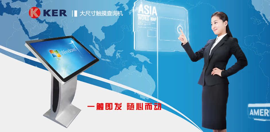产品说明 | 本连接包括:32寸冷轧钢烤漆机柜,第六代智能多点红外触摸屏,支持WIN 7,标配32寸全高清(1920*1080)LG液晶显示屏, 主机(技嘉H61 G1620 2G 64G全固态硬盘或500G希捷硬盘). | 品牌型号 | KER-TE01W 触摸查询一体机 (触摸屏查询机,查询机,触摸查询机,触控一体机,电子签到机,触摸教学一体机) |  | 尺寸规格 | 32寸(16:9) | 查询机柜 | 采用一级冷轧钢板,汽车烤漆,防磁,防锈,防静电,流线性设计,专业数控机床生产,做工精细,内部结构设计合理,符合人体工程学。可防尘,防水。可定制功 能,颜色。内置功放喇叭,风扇,电源插座,带电源口,网络接口,并预留走线口 | 触摸屏 | 采用真六点红外触摸屏,具有防尘,防水,防刮的特性,使用寿命长,精准度高,透光度>98%,反应速度快,分辨率4096*4096,单点使有寿命>6000万次。 | 显示器 | 采用全新LG全高清(1920*1080)工业级液晶屏,对比度5000:1,亮度:500md 反应时间<4MS,包无亮点、暗点。 | 控制主机 | 标配:工控主板 信步H61 G1620 2G 64G固态硬盘或500G希捷硬盘 或:技嘉H61 G1620 2G 64G固态硬盘或500G希捷硬盘 可选: 技嘉H61 I3 3220 4G 64G固态硬盘或500G普通硬盘 价格另计 (可按照客户的要求配置) | 查询软件 | 可免费提供查询软件模板,可自已修改,添加,删除图片文字,视频等内容。 如需按具体需求定制好,需另外收取定制费用。1500--3000元,根据具体需求再定价。 | 颜色 | 标配银黑,也可另外定制颜色 | 接口 | 带电源开关键,网络接口,USB接口,预留走线口。 电源开关(主机、显示器、音响、风扇)音量调谐 | 电源 | 电压:AC220V ±10% 50HZ ±1HZ 功率:<200W 开机瞬间电流3A | 音响 | 采用双声道,立体声环绕功放系统。 功率:2 x 5W 频响:20Hz~20KHz | 风扇 | 工控正轴流风扇,无噪音,循环散热。 | 工作环境 | 温度:-10℃~+45℃ 湿度:40%~80%(相对,非减压) | 网络接口 | RJ45或RJ11 | 物理尺寸 | 高1250mm ×长1060mm ×宽596mm | 选配功能 | 键盘\\小键盘、微型打印机、指纹考勤机、IC/ID卡、磁卡、条码功能,二代身份证,考勤机,摄像头等 | 应用领域 | 1、政府部门政务公开系统; 2、公共场所查询导航系统; 3、 学校网络多媒体教学系统; 4、电信部门业务公开系统; 5 、医疗机构就诊查询系统; 6、房地产楼盘销售查询系统; 7 、房地产智能楼宇监控系统; 8、企业接待大厅或产品展示厅; 9、高档娱乐休闲场所查询或系统应用 10、工厂生产线做工作台; 11、 配合应用软件可实现各种行业性应用...... |