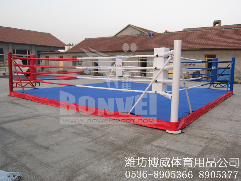 拳台选用优质国标防锈钢管制作底框架;角柱采用特种高强钢管制作,角柱表面采用进口防锈喷塑处理,防锈美观,角柱附带与底框架相连的高强支撑杆,可有效防止落地式拳台常见的角柱拉弯现象,独创三角耦合式角柱底座,使角柱可以方便、快速、牢固地与底框架连接;地面可铺设2.5-3cm厚度的环保高密度EVA软垫;软垫之上铺设优质蓝色帆布盖单或优质高强尼龙防滑革盖单;围绳采用标准四层结构(国标钢丝+优质塑胶软管+优质高弹橡塑管+优质PU革);四角靠背垫采用高回弹海绵内芯,优质进口仿皮外套;接触地面部件可全部包胶或加胶垫,不损坏场馆地面且消音效果好。所有配件齐全,即按即用,拳台整体结构坚固耐用。落地拳台为无高度触地式设计,具有产品价格实惠、安装时间短的突出特点。非常适合个人家庭及资金有限的中小型武术俱乐部、健身俱乐部场馆使用!!产品规格可根据客户需求定制。网站报价为排名价,请电话详询价格!电话0536-8905366 8905377 8905388