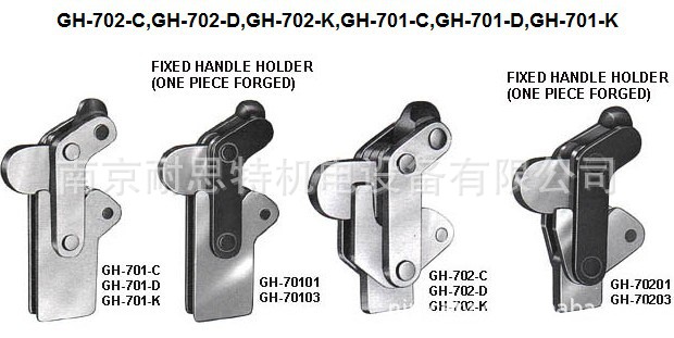 紧凑、多功能完美设计,加上特殊材料制作的枢轴和轴套等零件,保证承担繁重且高频次生产速度的需要,具有很高的耐久性。 用户需要在安装位置上将夹钳用焊接方式联接,并选择理想方向将手把焊装连接。 GH-701系列: 在设计的安装位置上将夹钳焊接安装,并在理想的空间位置焊装手把并点焊固定与手把连接的头部,使其操作方便自如。