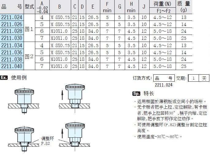 旋钮柱塞(迷你型)Index Plungers mini indeses,EH2211.024,EH2211.026,EH2211.028,EH2211.030,EH034,EH2211.036,EH2211.038,EH2211.040也称拉销,分度销.特长 适用锁固于薄钢板或空间小的场所。无卡锁:把手上拉,定位解除,有卡锁:把手上拉回转30°,梢子内缩,定位解除,把手放下即作定位动作。可使用调整环调整分割定位柱高度。使用温度-30℃~80℃。