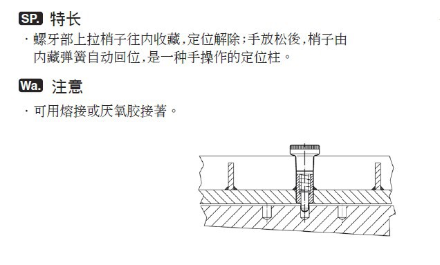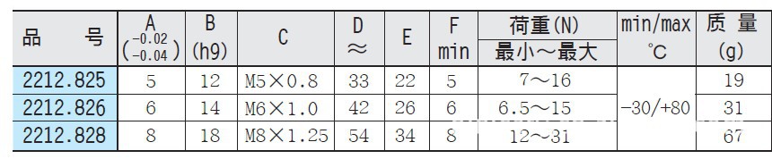 品号 | A -0.02 -0.04 | B h9 | C | D ~ | E | F min | min/max ℃ | 质量 (g) | 荷重(N) 最小~最大 | 2212.825 | 5 | 12 | M5×0.8 | 33 | 22 | 5 | -30/+80 | 19 | 7~16 | 2212.826 | 6 | 14 | M6×1.0 | 42 | 26 | 6 | -30/+80 | 31 | 6.5~15 | 2212.828 | 8 | 18 | M8×1.25 | 54 | 34 | 8 | -30/+80 | 67 | 12~31 |