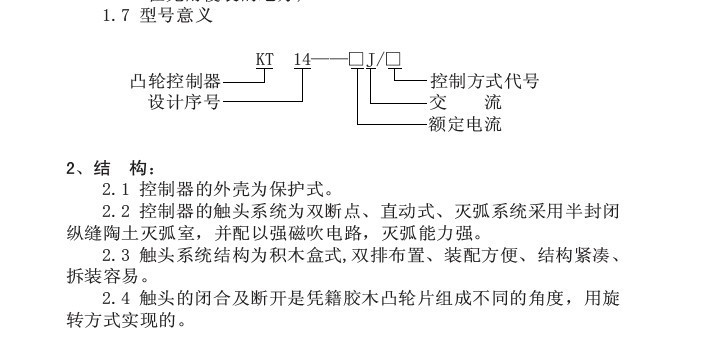 1.1 KT14系列凸轮控制器(以下简称控制器)用于交流50赫兹电压至380伏的电路中,主要作为起重机交流电动机的起动和换向之用。此控制器具有可逆对称的电路,适用于起重机的平移机构和升降机构,也能作用同类型性质电动机的起动、换向和调整之用。