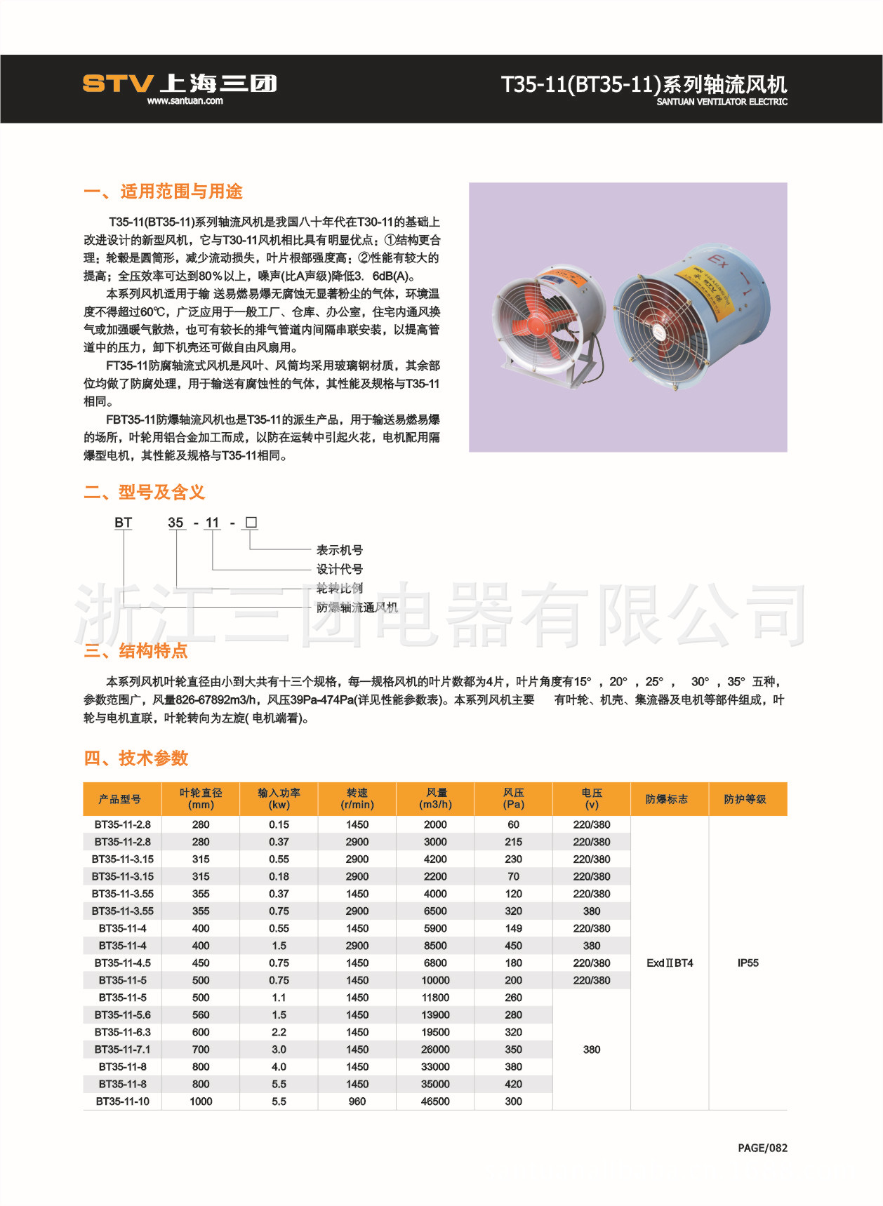1.风机的用途 BT35主要是为了工厂、仓库等有易燃、易爆气体场所通风换之气用,在较长的排气管道内间隔串联安装,以提高管道中的风压。该系列轴流风机是在国外同类产品的基础上,通过模型试验研究,确定了风机叶型,采用了圆筒型轮毂结构,同时对电机进行了改型设计,减少了流动损失,因而合风机效率出口按圆面积计算提高到77%,按出口环面积计算提高到89.5%,哭声比A声降低了3.6dB,又叶根处的强度,避免了叶片断裂现象。 BT35型防爆轴流通风机主要是排送含有易燃、易爆但无腐蚀性气体之用,电机须用防爆电机,开关须用防爆开关或远离易爆点,在易爆区域内电线不许有接头。 通过BT35风机的气体应无腐蚀性及显著粉尘,其温度不得超过40°C。