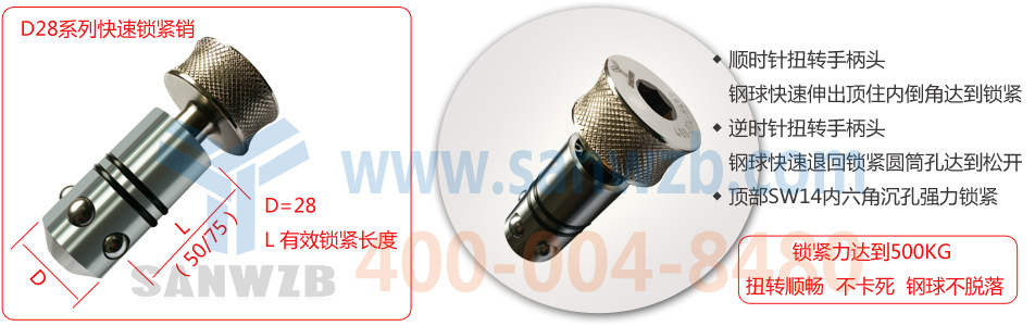 快速锁紧销是一种通过旋转螺杆头部或手柄实现模块与模块、模块与平台之间轴向快速锁紧或松开的圆柱销。主要组成元件:锁紧体、锁紧杆、钢球(或手柄),不同结构形式还有其他不同的元件。按直径分为D16和D28两大系列,应用于平台与附件、附件与附件之间快速锁紧,有装夹快速等优点。1)顺时针扭转手柄头,钢球快速伸出顶住内倒角达到锁紧2)逆时针扭转手柄头,钢球快速退回锁紧筒孔内达到松开3)顶部SW14内六角沉孔强力锁紧