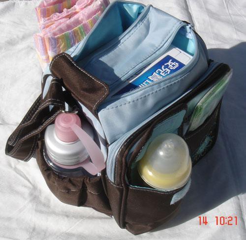 这款妈咪包有大小两个款,采用双拉链开盖结构,可以全部打开包的顶部,很大体积的东西取放都很方便。包内有一个大拉链袋,两个网格袋(可以放奶瓶等物品)以及一个敞口袋,可以分别放下宝宝的所有物品.