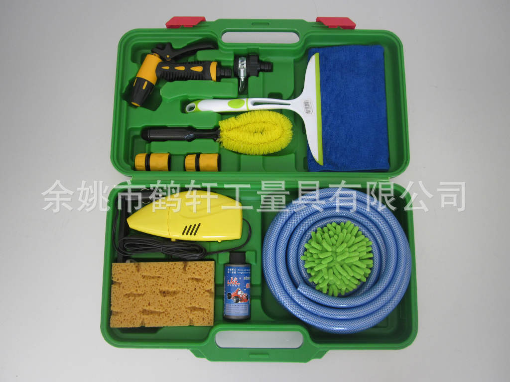 品名/Description Size 件数/Size洗车水枪 1pc通水接 2pc万能接 1pc8米海蓝管 1pc水刮 1pc轮毅刷 1pc迷你吸尘器 1pc珊瑚海绵 1pc浓缩雨刮精 1pc雪尼尔手套 1pc