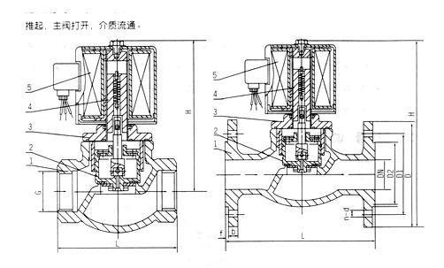 常开电磁阀,线圈通电后,衔铁在磁力作用下下移,推动副阀关闭,由于主阀阀杯上下压差趋于相等,主阀阀杯由磁力和自重压紧密封面,阀门关闭。线圈断电,磁力为零,衔铁和副阀塞由弹簧作用上升,副阀打开,主阀阀杯内介质经副阀流走,压力下降,主阀阀杯由上下压差作用向上升起,主阀打开阀门开启。