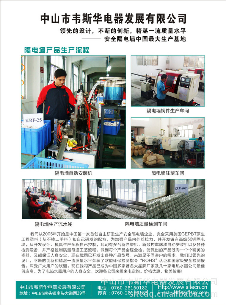 本产品属本公司第四代专利防电墙,是进出水口镶内丝外丝铜件的,改变了过去传统式全是塑料的,使进出水口不容易被扭滑丝,又是行业内一次技术性的突破。此防电墙产品已深得国内各大热水器品牌的认可,目前以成他们最佳供应商!