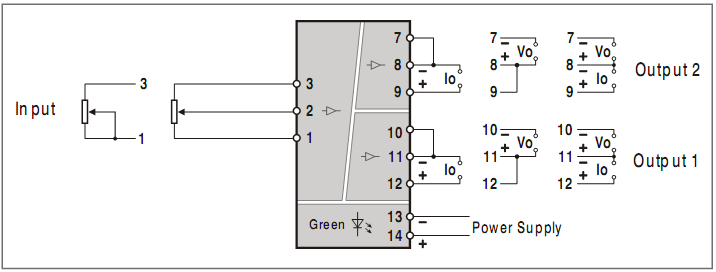 - 一路通道电阻值输入,经隔离变送,一路通道输出直流电流或电压。