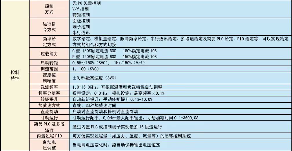 1、三种控制方式:无PG矢量控制(SVC)、V/f控制、转矩控制;