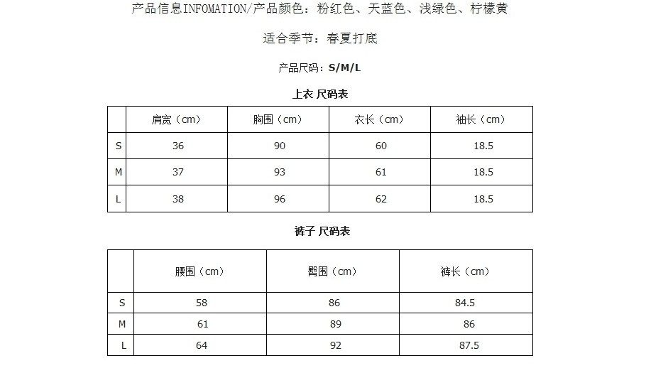 天蓝色+白裤,天蓝色+灰裤,浅绿色+白裤,浅绿色+灰裤,粉红色+白裤,粉红色+灰裤,黄色+白裤,黄色+灰裤