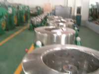 离心脱水机:按容量大小分为:φ500、φ600、φ800、φ1000、φ1200、φ1500脱水机。该机为三足悬摆式结构,由三角底盘、铸脚、园底盘、转鼓、外壳、电机等组成。转鼓、外壳均采用优质不锈钢制作。由三角胶带传动,电机直接带动起步轮,使机器缓步起动,达到设计转速,以保证机器运转平稳,机器内有制动装置,制动性能好,能使机器在短时间内停止运转。