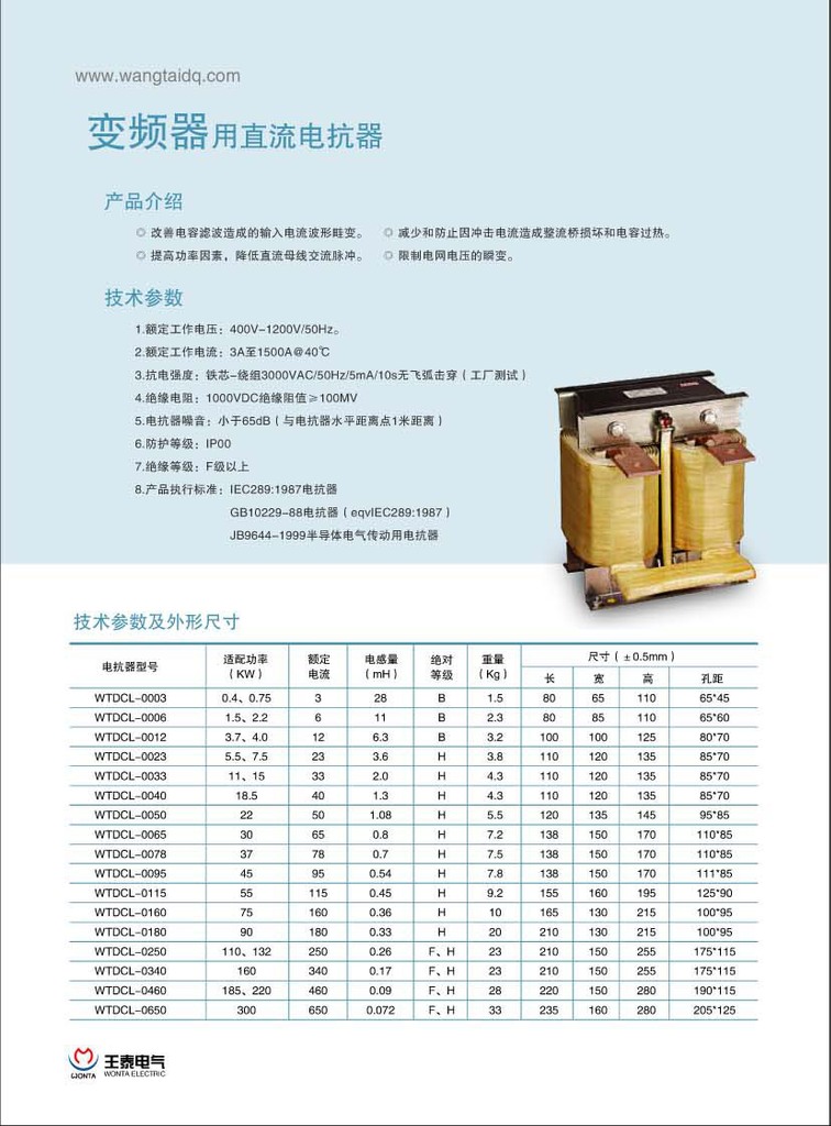 王泰电气,节能中国。上海王泰电气有限公司为一家高科技创新型现代化股份制企业,专业生产各类电抗器、变压器,专注于无功补偿、谐波治理、变频器领域,专心于各种变压器及稳压电源行业,专利于全社会的节能降耗及服务于中国的电力领域。