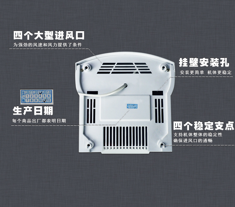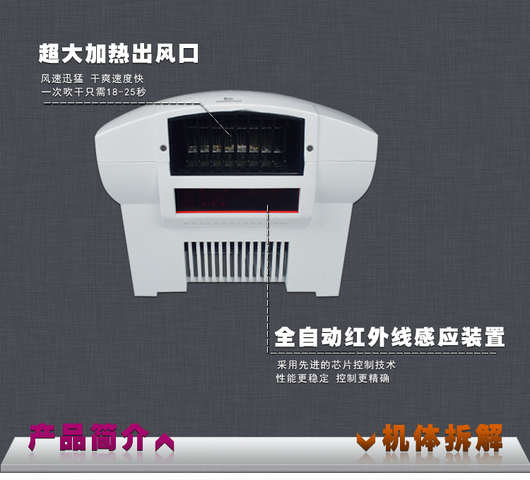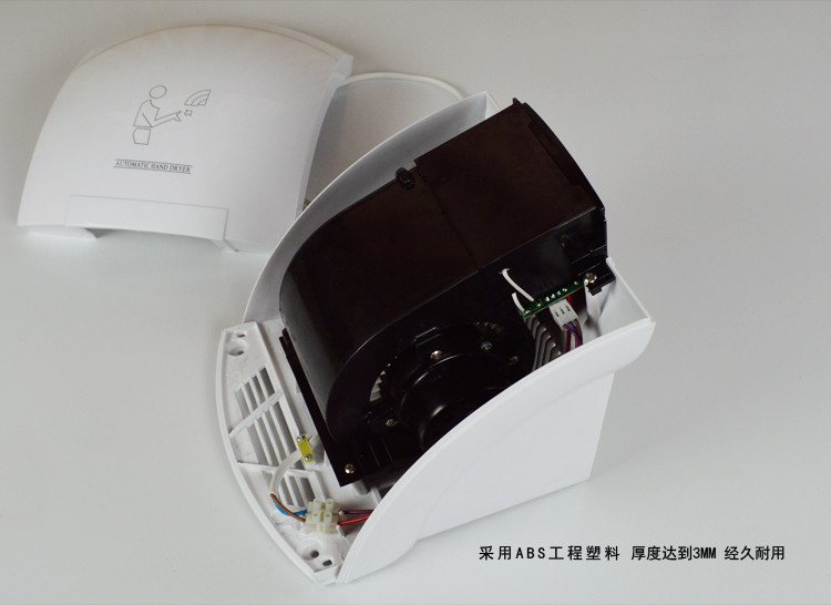 在现代干手器是先进和理想的卫生清洁器具和设备。它主要运用于宾馆、餐馆、科研机构、医院、公共娱乐场所和每个家庭的卫生间等。当洗手后,将双手伸在自动干手器的出风口下,自动干手器会自动送出舒适的暖风,迅速使您的双手去湿变干,而当您把手一离开自动干手器风口时它又自动停风关机。可达到不要毛巾擦干手上水分和防止疾病交叉感染的要求。