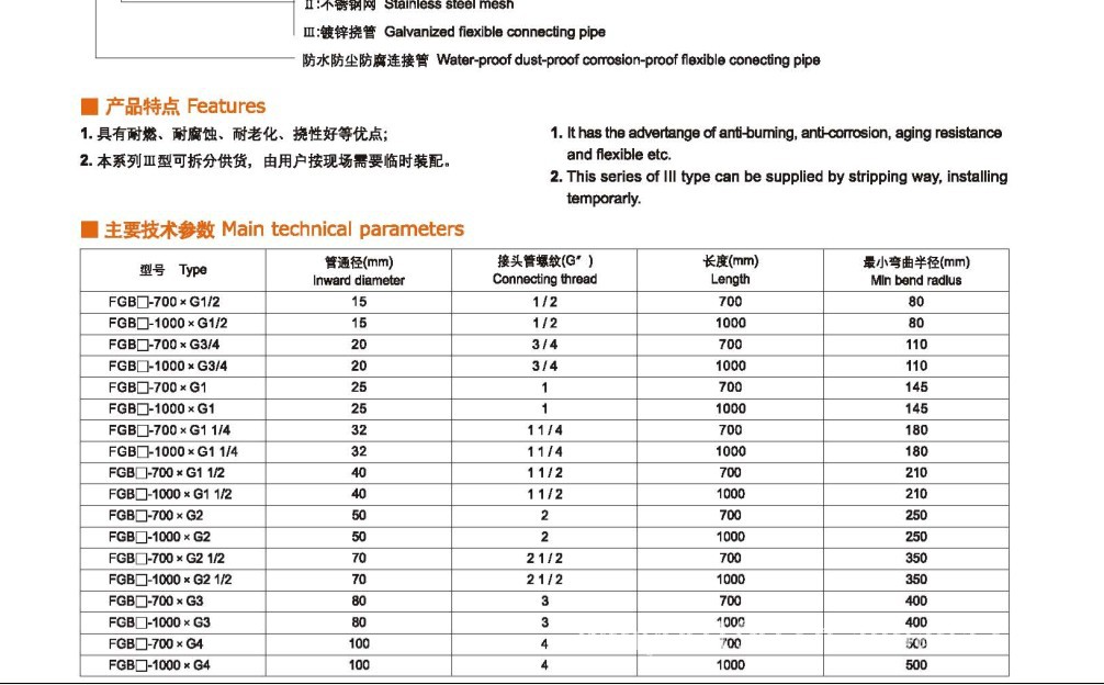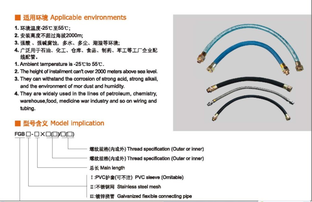 产品特点:防爆挠管由活接头与连接管组成本连接管由内管与护套组成,活接头由不锈钢制作,或优质碳素钢电镀处理,内管由波纹管或金属软管制成,具有良好耐腐性,且有阻然,耐腐蚀,耐水,耐老化,挠性良好,结构牢固,工作可靠等特点,螺纹尺寸规格可根据用户要求特殊加工,如NPT纹,英制以及公制螺纹等,防爆挠性管长度,常规供货有500MM、700MM、1000MM可供选择,也可根据用户需求订制其它长度,三种不同材可供选择。