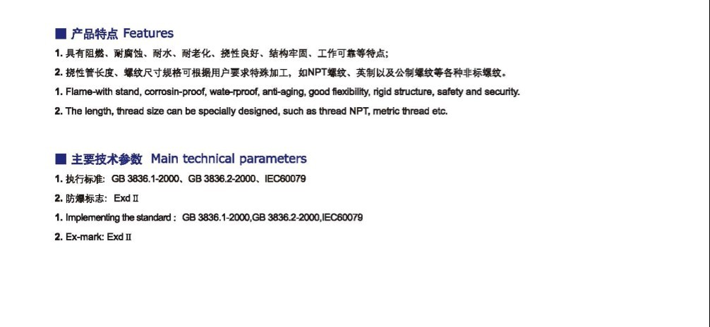 产品特点:防爆挠管由活接头与连接管组成本连接管由内管与护套组成,活接头由不锈钢制作,或优质碳素钢电镀处理,内管由波纹管或金属软管制成,具有良好耐腐性,且有阻然,耐腐蚀,耐水,耐老化,挠性良好,结构牢固,工作可靠等特点,螺纹尺寸规格可根据用户要求特殊加工,如NPT纹,英制以及公制螺纹等,防爆挠性管长度,常规供货有500MM、700MM、1000MM可供选择,也可根据用户需求订制其它长度,三种不同材可供选择。