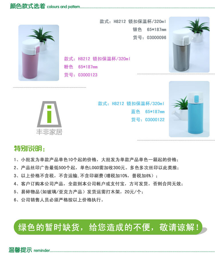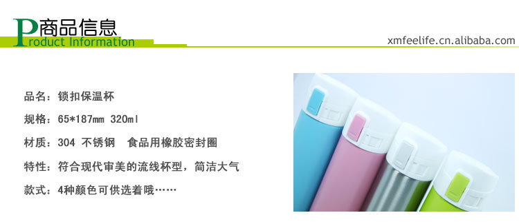 -- 该款保温杯引进先进的生产线、精密加工制作而成;时尚的外观与完美的色彩搭配设计,新颖美观、大方实用;
