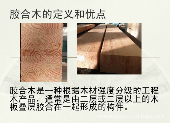 胶合梁(Glued Laminated Timber,简称为Glulam),为一种工程木料产品,取源于丰富的木材,而又可充分的发挥结构化的特性。它由一段段的木料胶合而成,每一段材料的尾端切成锯齿状,以指接方式胶合而成,以达到所需要的长度。对于这样的结构,从第二代到第三代的森林中所砍伐的较小的木材,也能制成大梁,而且各类树种皆可适用。胶合梁的问世,使得在木材的选择上,不需依赖成年老树却依然可以有大跨距,高强度的建筑设计。