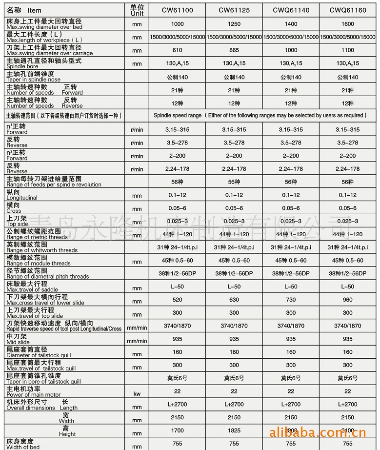 青岛永隆机床制造有限公司是生产大型车床的专业厂家。公司主导产品有各种规格型号的大型连体、分体落地车床,重型卧式车床,立式车床,还可根据用户特殊要求进行非标设备的设计生产。公司生产的系列车床有二十余种规格,主要适用于风电机械、纺织机械、矿山机械、化工机械、铸造机械、橡胶机械、轮胎模具、锅炉压力容器、各种法兰、管件、阀门及盘状类、大直径工件的切削加工,能够车削各种大型零件的内外圆柱面、圆锥面、端面及曲面圆弧等成型表面。机床工作精度高、刚性强、外形美观、操作简单,性价比高,是用户之首选。
