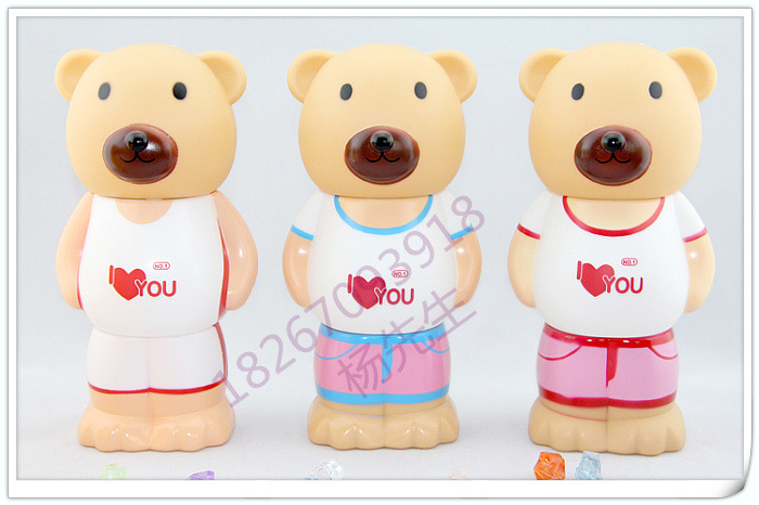 2、三节熊存钱罐储蓄罐,头可以转动,可爱的卡通~~可以分为头部、上身、下身三个部分,每个部分都是一个独立的存钱罐,连接起来又是一个完整的站立造型!既可爱又实用!存储零钱的好帮手!也是浪漫的爱情礼物!