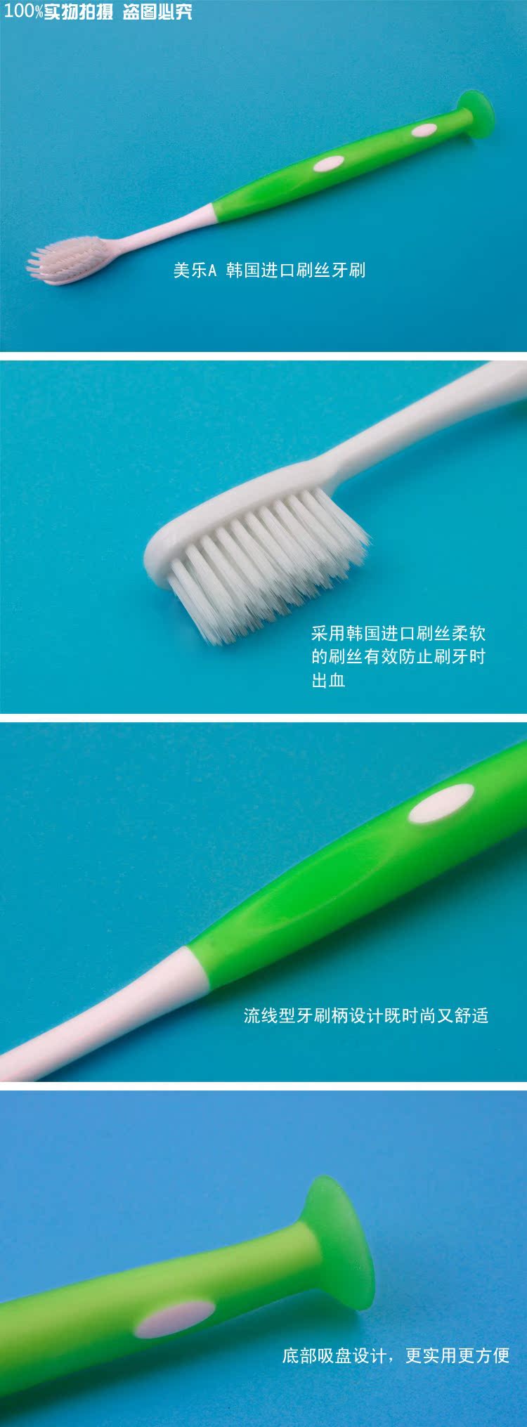 微细的柔丝软毛能深入牙缝,更有效清洁牙缝异物,柔软毛对牙龈、牙釉质不会有损伤,反而有效按摩牙龈,促进牙龈组织血液循环;提高牙齿免疫力!人性化的牙刷吸盘设计,可以任意吸附在玻璃等光滑物体上。
