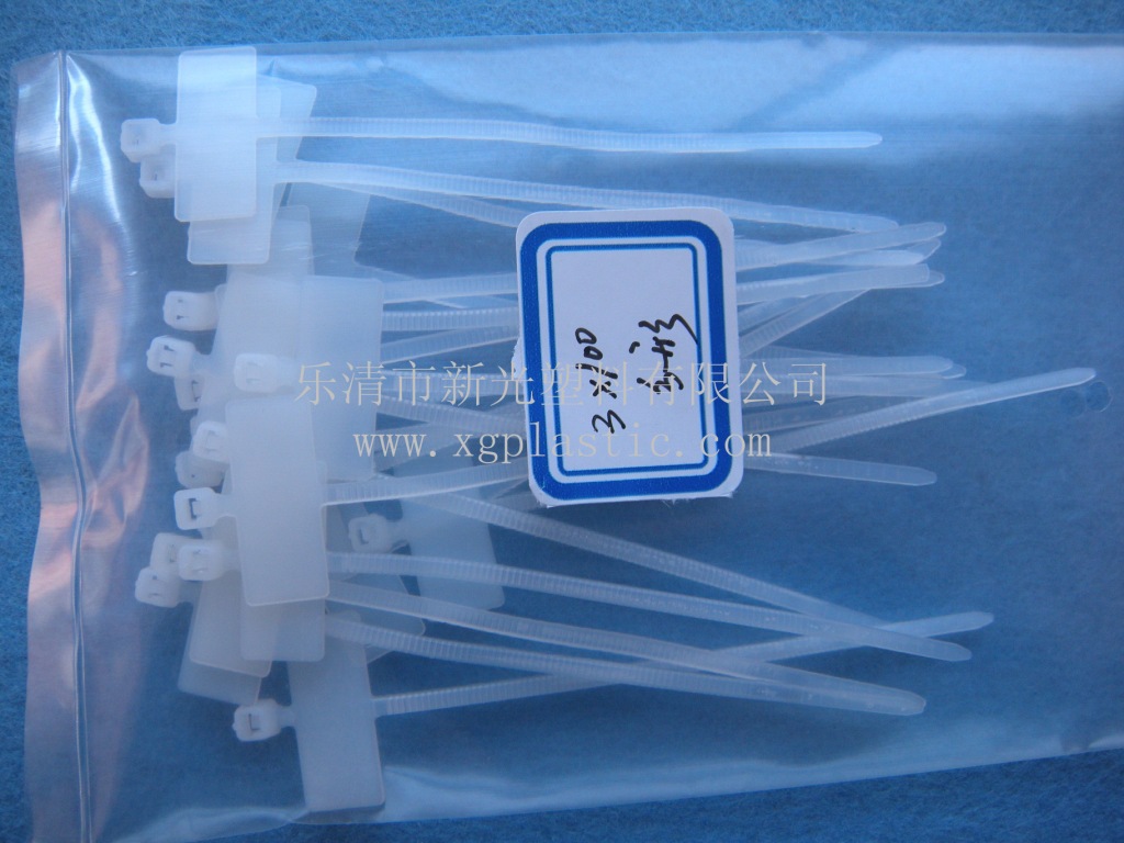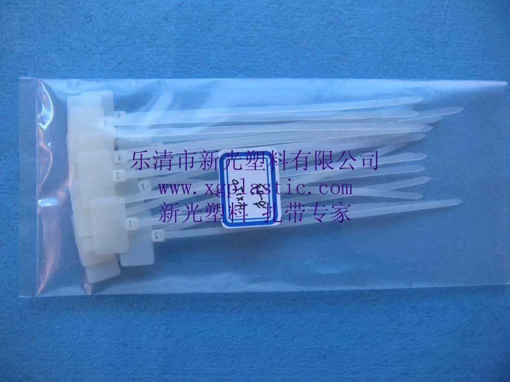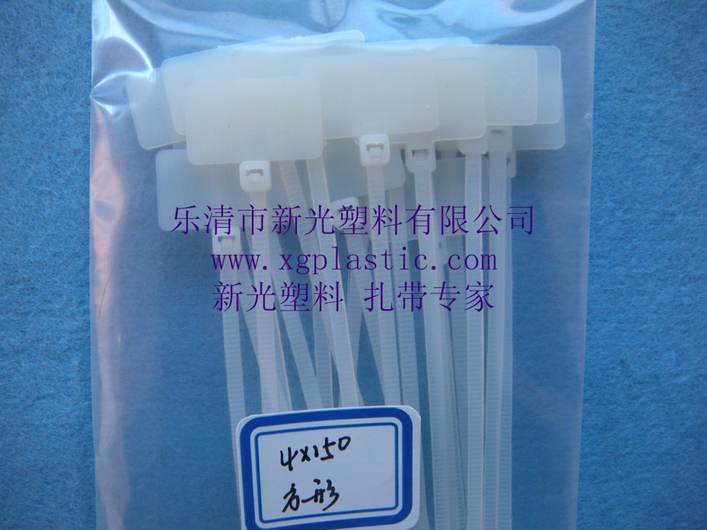 品名:标牌扎带材质:采用优质阻燃PP,PA66工程塑料制成,绝缘性佳,耐酸耐腐蚀。规格:3*100 3.6*150 3.6*200用途:标牌可贴上或印上单位,日期,顺号,条码等各种需要的内容,适用于金融,百货,养殖,航运等货物商品的标识与固封。