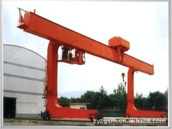 L型门式起重机其主要由门架、起重小车、大车运行机构、司机室和电气控制系统组成。 门架为箱形结构,起重量20t以下时小车采用垂直反滚轮式,大于20t时小车采用水平反滚轮式,在主梁一侧运行,主梁采用单梁偏轨形式,支腿为L形,吊运空间大,过跨能力强,便于将物件从跨内转运到悬臂下。