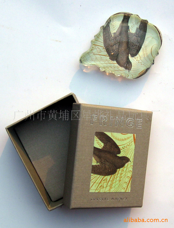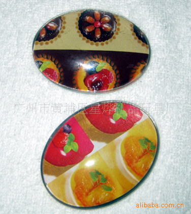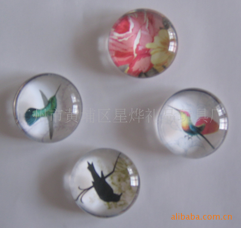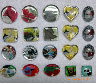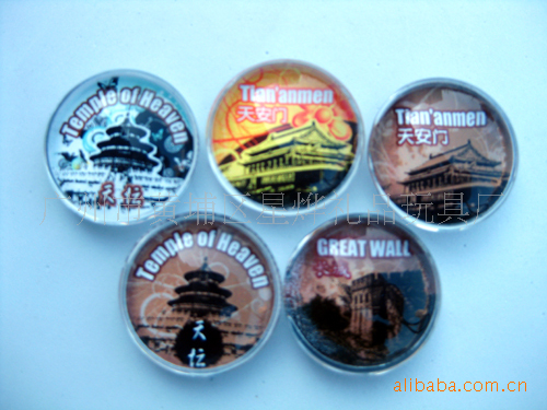 11)玻璃冰箱贴:采用背面软胶磁铁+上面铜版纸彩色印刷+半圆玻璃腹膜制作而成