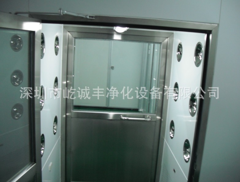 4、 用途及特点:风淋室是操作人员进入洁净室时使用的人身净化装置。它利用高速洁净气流吹淋除掉进入室内人员身上的污物。其喷嘴可调节,以便有效除去人身上的灰尘,并阻止外界污染进入洁净区域。它也可应用于大件货物的吹淋。
