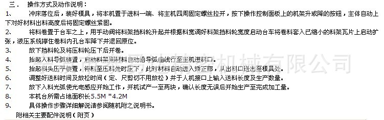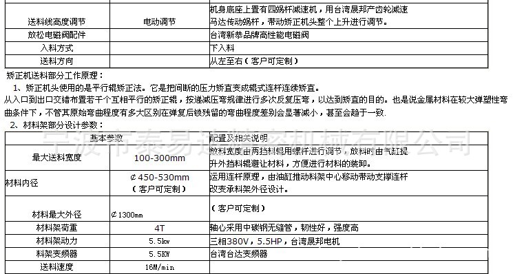 NCJD系列三合一:最大料宽400mm,料厚:0.8-4.5mm,液压扩张,扩张450-530mm,材料外经φ1300,变频调速,载重4-5吨,5.5kw台湾晟邦齿轮减速马达。气压式压料头,油缸托料臂,气压式压料臂,送料口导料架装置。送料线高度采用丝杠涡轮电动调整装置,滚轮整平机与送料机安置于同一机台上,可减少送料与整平时误差达到高精度需求,安装时方便且不占空间。光电料弧控制系统,送料滚轮矫正滚轮电镀处理,料架含空压碟是式刹车装置。滚轮2组(上4下4)机头气缸采用朝日牌,采用最精密4.4KW日本安川伺服马达驱动,三菱PLC,威能彩色人机界面操作。操作简单有效缩短工作准备时间,提高生产力。使用寿命长、精度高和维修简便,适合于材料厚薄不同、送料步距不同的冲压加工。其他按客户要求做。