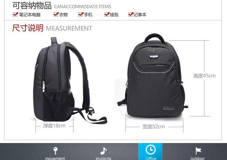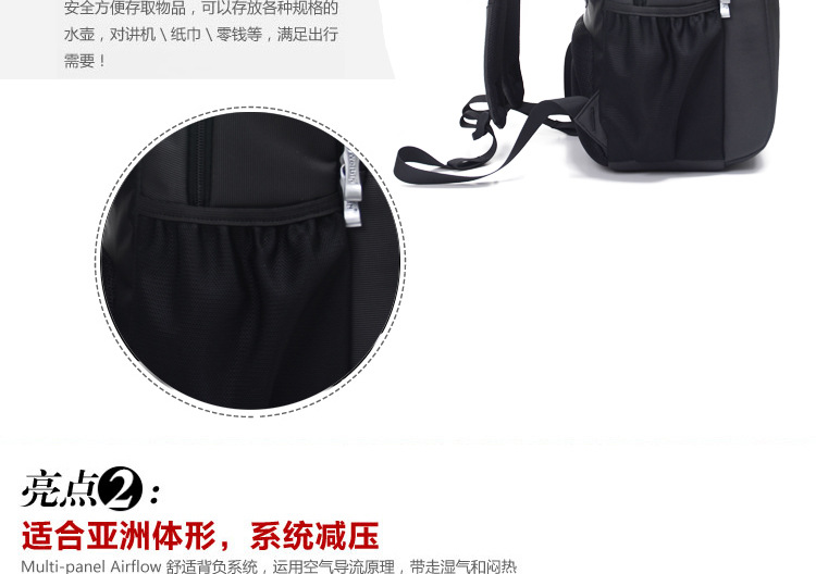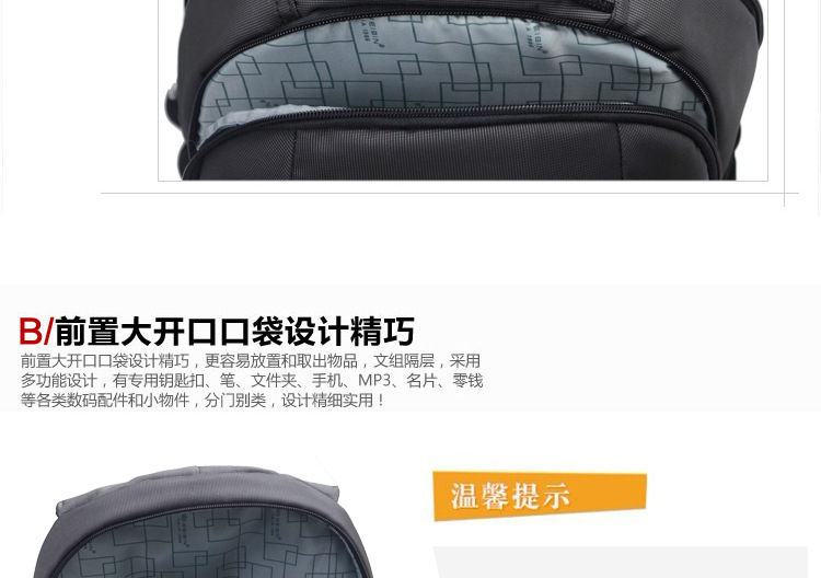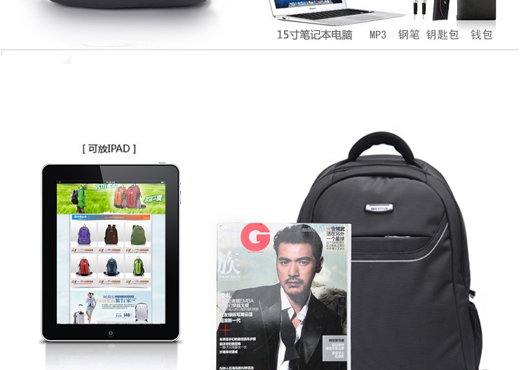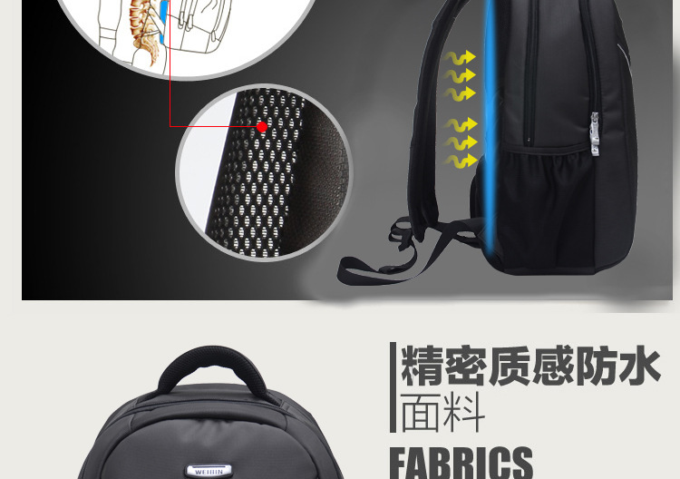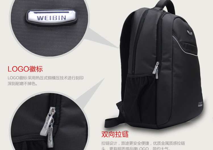 产品信息【产品名称】威斌厂家直供定制商务礼品背包韩版双肩包电脑背包笔记本背包WBX7【产品品牌】威斌 WEIBIN【产品货号】WB-X7【产品等级】合格【产品产地】CHINA【产品质材】进口尼龙防水【产品配件】双肩背带,包包外层内隔层众多,电源适配器等都可以容纳。背带扣坚固耐用【适用人群】中青年时尚男女【推荐指数】★★★★★商务休闲类的包包舒适的流水曲线型肩带,能有效的起到防滑落的作用。厚软的海绵结构能有效的缓冲外力对肩部,腰部,尾椎部的压迫,无论您是出差,旅行,还是日常背带电脑或其他物件,都能很好的保护您的身体及物件不受损伤。肩带与包身的宽面积自然缝合,完全解决的普通背包肩带缝合处易于开裂的弊端。采用尼龙面料,具有防水功能,极其富有质感,做工精致,每一个细节都体现了威斌的不凡魅力。豪华精致的做工与设计搭配富有品位的您,适合任何场合。威斌箱包极尽奢华之设计,显示您尊荣华贵的象征,体现与众不同的气质!让您脱颖而出,备受注目!此包包人性化,多功能设计,让您带着轻松愉快的心情工作休闲!