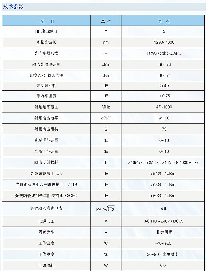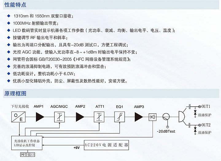 OR200系列性能特点: --采用效率高、电压适应范围宽的开关电源24V/1A; --射频通道工作带宽47-862MHz/1000MHz; --实时监测光接收机的光输入功率,采用数码显示调节均衡、衰减; --光AGC控制,输出设定后,光输入功率变化在-8dBm—+2dBm时,输出电平105dBm恒定不变.