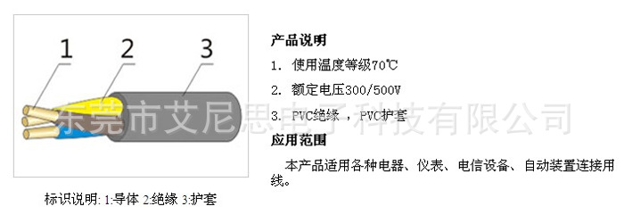 型号 | 芯数和标称截面 (N×mm²) | 绝缘厚度 (mm) | 电缆参考外径 (mm) | 电缆参考重量(kg/km) | 20℃导体最大直流电阻 (Ω/km) | 60227 IEC 53 | 2×0.75 | 0.6 | 6.5 | 60.3 | 26.0 | 2×1.0 | 0.6 | 6.8 | 68.7 | 19.5 | 2×1.5 | 0.7 | 7.8 | 94.3 | 13.3 | 2×2.5 | 0.8 | 9.5 | 145.3 | 7.98 | 3×0.75 | 0.6 | 6.9 | 71.8 | 26.0 | 3×1.0 | 0.6 | 7.2 | 83.7 | 19.5 | 3×1.5 | 0.7 | 8.5 | 114 | 13.3 | 3×2.5 | 0.8 | 10.3 | 177 | 7.98 |