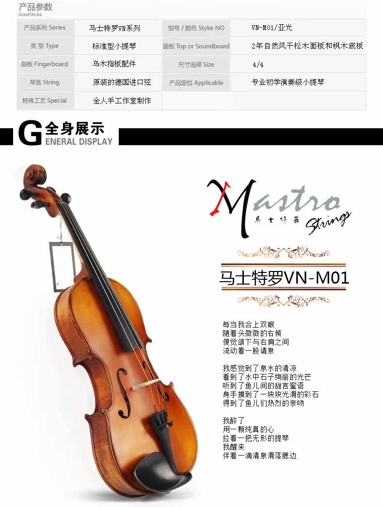 Mastro马士特罗VNM-02初学小提琴 纯手工实木 白松面板