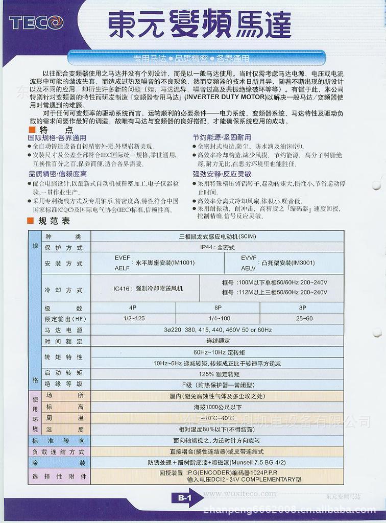 东元变频马达系针对变频器的特性研发而成,有效解决了马达温升,噪音过高及共振绝缘破坏等问题,具有起动转矩大,节省起动停止时间,采用耐振动,耐冲击,高精度之编码器速芭回授,控制精确,信号反应灵敏等特点