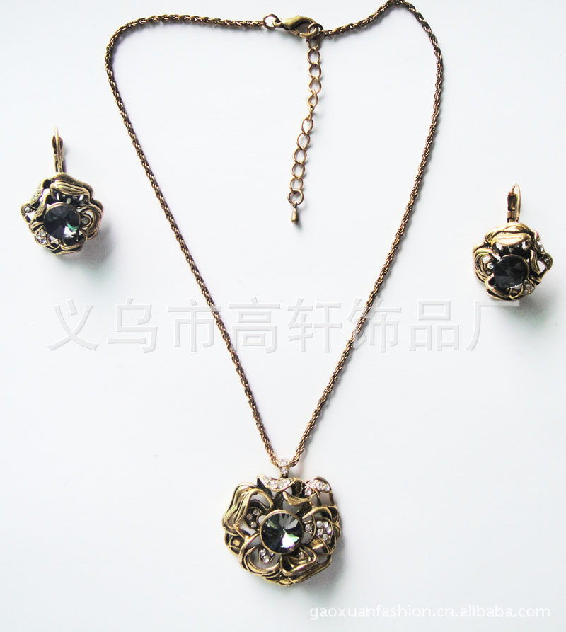 此款项链项链+耳环套装目前较流行的欧美款式之一,产品的亮点之处在于将合金和钻石/天然石头/树脂完美的结合在一起,电镀颜色/钻/树脂/石头的颜色都可以随意搭配。欢迎各位新老客户选购定做。