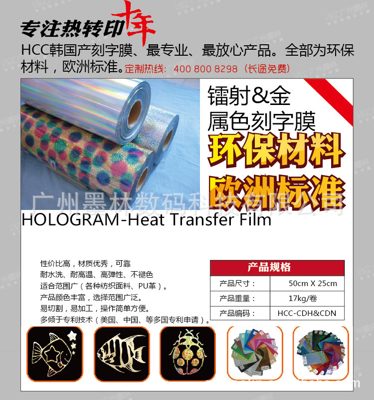 广州墨林数码科技公司专注热转印行业10年。一直代理韩国HCC公司生产的各种热转印刻字膜,现有PVC,PU,夜光,反光,植绒,金葱,镭射和金属亮光(烫金效果)的八个系列,六十多个花色品种;材料品质优良,放心使用。现在就动手DIY自己的所爱。。。。。